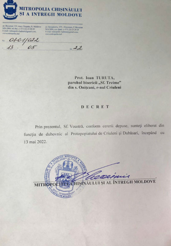 La data de 13.05.2022, prin binecuvântarea Înalt Preasfințitului Vladimir, Mitropolitul Chișinăului și al întregii Moldove, prot. mitr. Ioan Turuta, paroh al bisericii ”Sf. Treime” din s. Onițcani r. Criuleni, conform cererii depuse, a fost eliberat din funcția de duhovnic al Protopopiatului de Criuleni și Dubăsari, pe motiv de sănătate.